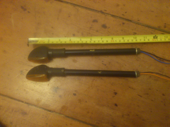 Extended front indicators for IVA. These are taken off my Haynes Roadster, standard arrow type motorbike indicators. The extensions are approx. 250mm long from indicator end to end of the extension. Also includes drilled out bolts for the wires to pass through, and approx. 300mm long wire tails. End of the extensions are slightly angled to suit my nosecone. I paased IVA with these fitted.