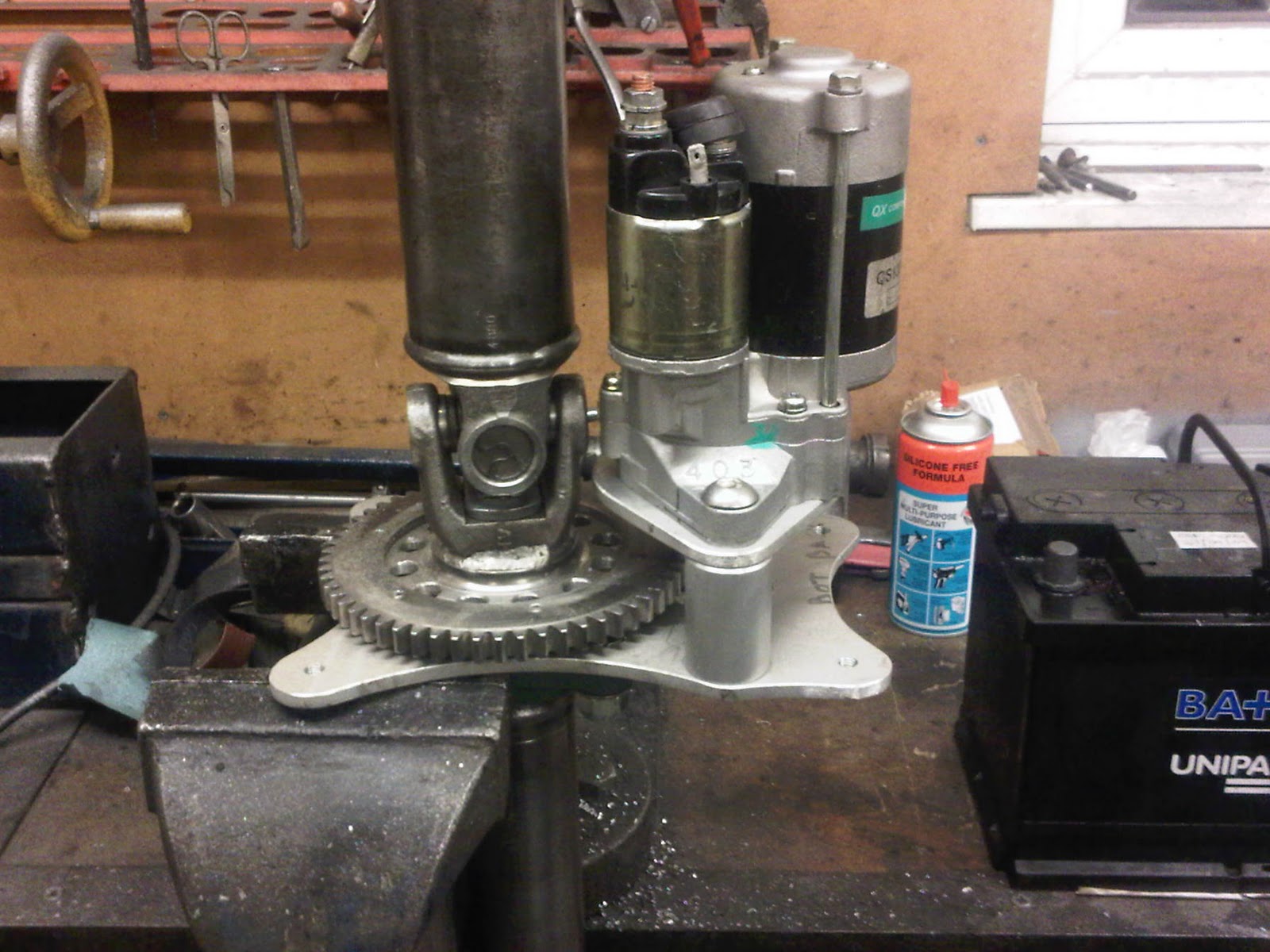 mounts on the left side of the engine onto a custom made plate to allow the strater to fire forward to engage the cog and giving it the direct drive