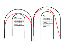 You can brake harder than you can accelerate, so as the rear becomes light you will slightly slide through the entrance to then bend, unlike road driving you should be breaking hard through the bend until you hit the apex to get minimum time around.