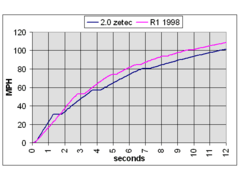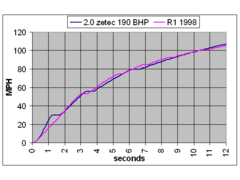 Here is a graph I made a few weeks ago comparing a standard 2.0 zetec against a standard 1998 R1 in otherwise identical cars. It assumes 3.62 diffs,