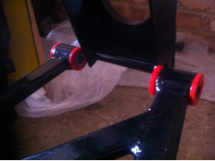 is the tube welded in the bottom. From the look of it a long threaded bar goes al the way through the tube and through the poly bushes, but that also