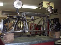 I'm finally suspended!!  Whatdy' think?? Upper bones are bought (Joe's Racing, USA) and we fabricated the lowers. Upper bones