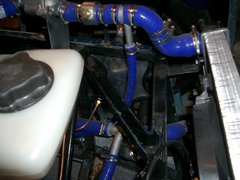 pump inlet (near sprocket) goes to tee piece, one side to bottom of rad, one side to expansion bottle main port.