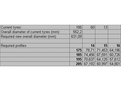The overall diameter of Andy's tyres is 596 mm and the resulting gearing is longer than mine by A LOT (he gets 6500 rpm where I'm getting