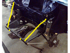 bolts, one in the subframe and one through the valance. If you run a flip front brace the subframe to the inner wing.