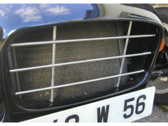 ISTR holes in grille should be no more than 45mm. I have 4 horizontal rods, and was advised to fit mesh behind at first SVA. I did and liked it better so its still on.