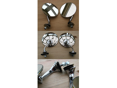 They have 4" mirrors (flat glass), stainless backed with chromed stems. They fit with a single M8 bolt (complete with rubber bases, large washers
