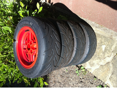 4x Ford Laser alloys with Yoko AO48s (185/60/13), medium compound, with ~3mm tread left. All wheels recently powder coated bright red (1 is a