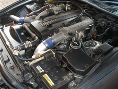 It has a new front mounted intercooler, on standard turbos but with custom dump pipe, 3" decat & custom oval stainless back boxes. Also