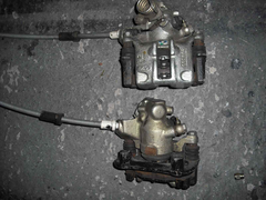 Pair of good condition rear Sierra calipers for solid disks complete with mounting brackets, worn pads and cables.