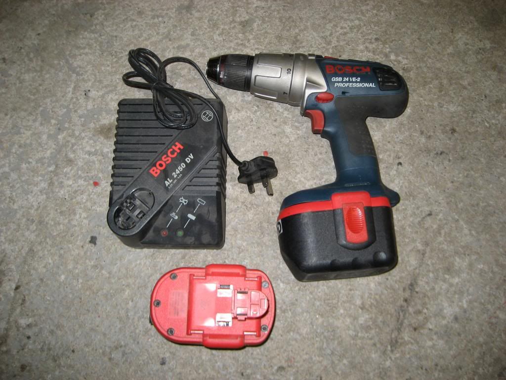 Bosch GSB24VE-2 Cordless 24v battery drill with 2 x NiMh batteries, inc charger. 1 x battery is good and holds a decent charge the other drains fairly