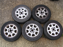 As above 5 alloy wheels 14" sierra stud pattern will need reconditioning. Tyre dubious will need replacing for road use OK as build wheel.