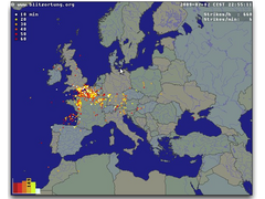 Each dot represents a lightning strike, and that great big patch has been creeping up from France!