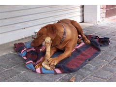This is one of our two Rhodesian Ridgebacks enjoying an ostrich shin bone while on guard duty outside my garage.