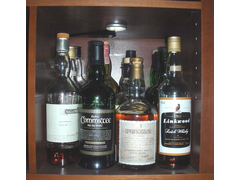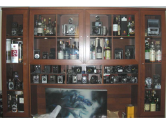 one cabinet half full of cameras, half full of scotch