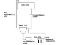 I was just looking at your diagram - I though the return from the fuel rail usually went back to the tank, otherwise you are circulating the same fuel
