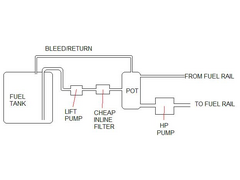 Facet cheapy lift pump without its pre-filter(spawn of the devil) but with £1 inline filter after it into a four pipe swirlpot. Big pipe in the bottom to feed the HP pump. Medium pipe mid pot for lift pump to feed into. medium pipe at the top for return from the fuel rail. Small pipe at very top for return to tank.