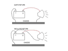 Insulated return: As above, but other side of headlight bulb is connected to the battery negative with a separate insulated wire instead. The chassis