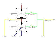 The three circuits all work(tested) as they are shown currently, when main beam is switched dipped goes off as 12v is then at either side of the coil