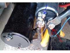 wire. The smaller threaded terminal, arrowed in blue, connects to what?