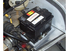 Easy way is to use a battery tray from a production car that clamps the battery by the base mine came from a Rover 820 and has a nice plastic tray to