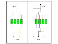 I run the same as on the left, two injectors together, this is what Emerald use as does Rover. I suspect the other diagram is wrong as the other