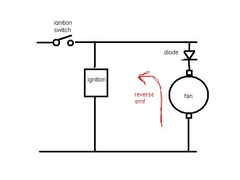 Putting a diode in the ignition circuit won't work cos the spurious current from the fan will be flowing in the same direction as the ignition