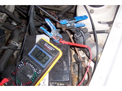 1st start the car, put the meter across the battery terminals set to volts and see what the voltage is, it'll be quite low while the battery