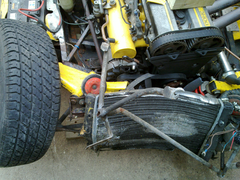 the brunt, smashing the alternator, the steering rack looks a bit wonky, and the wishbone is well and truly wished on, but everything else seems