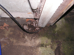 The concrete floor is cracked due to nearby tree roots and this is in the area where the floor is wet. (I guess the damp proof membrane is also
