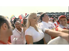 Cameraman just had to get her in i suppose, rude not too. She deffinatly made the most of the camera, my thoughts were "dead heat in a zepelin race" made me smile anyway.
