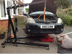 Manuals got, clutch bought, engine crane snuck in under the cover of darkness, saturday used up and me very knackered but the new clutch is in and the
