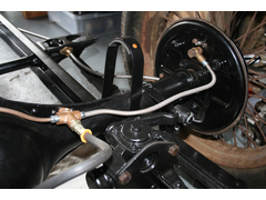 The front axle, springs and hubs went on no problem and the next stage was to restore the handbrake lever mechanism. This is a rather complicated affair with a strange adjustment mechanism. It was all seized and had to come apart and be rebuilt. The lever goes across the full width of the frame and pulls on two separate hand brake cables. One of these was fine, but the inner cable on the off side one was frayed. New cables don't look the same but luckily I found a local cable manufacturer who put a new inner into the original outer.
