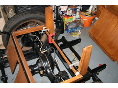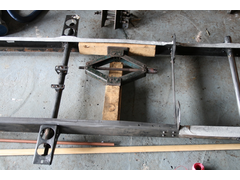 Next the chassis. First I did a lot of detailed measurements and found that I needed to do a small amount of straightening to get it back within tolerance. This was done with a jack and blocks of wood.