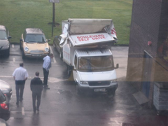 hmmm, a car park with one of those metal barriers thingys to stop van getting in? its a boulevard van, so self drive hire, so he doesn't