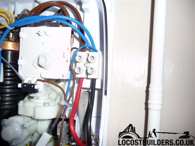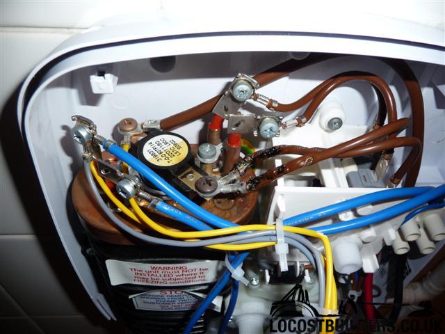 Inside, there are the two connections that your mains cable, presumably 6mm is connected to. Just to the left is the heater, connected to the brown