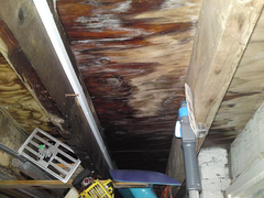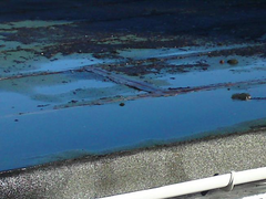 and off for years) the wood will be replaced when the felt is done. its got a big dip (more like a step) in it where the puddle forms, so that needs