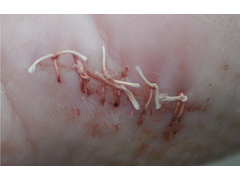 They dont look like dissolvable stitches as they are normally black. The ones he has look like an old shoe lace!!