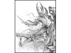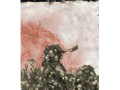 its a fella with an axe on a pile of bodies. not sure about the background. I think its a drawing rather than a photo though!