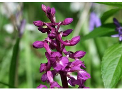 three lobes and the upper petals form a hood. The leaves of the Early Purple Orchid are glossy and dark green with dark spots, and form a rosette on