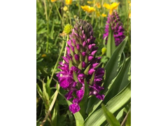 Early Purple Orchids display up to 50 dark purple flowers arranged in a dense, cone-shaped cluster on a tall spike. The lower lip of each flower has