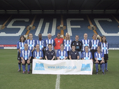 Middle of the back row, between the goalies, she's not playing at the mo, what with being 6 months pregnant.