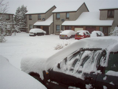 According to my webcam, it started snowing at 7:30 then stopped, then hasn't stopped since 8:00, it's getting a bit thin now.