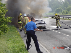 He smelt fuel and whilst pulling over the vapour ignited from the indicator being turned on - apparantly the most common cause of car fires according