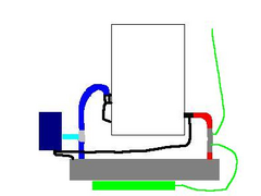 white box is the engine, dark blue is header tank with pressure cap, grey box is radiator, green box is fan, blue pipe is the lower hose, red one is
