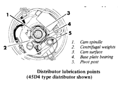Normally way to this put a single drip of engine oil on screw revealed when the rotor arm is removed also two drips of oil below the base plate.