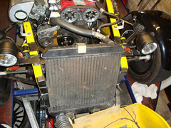 The 2 red hoses go to the bottom of the Tiger rad. The tiger rad had an inlet at the bottom left and in the middle of the bottom tank. When I swapped
