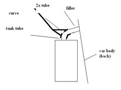 across the car,slightly downwards, and another to get it into the tank, with a joining piece in the middle.