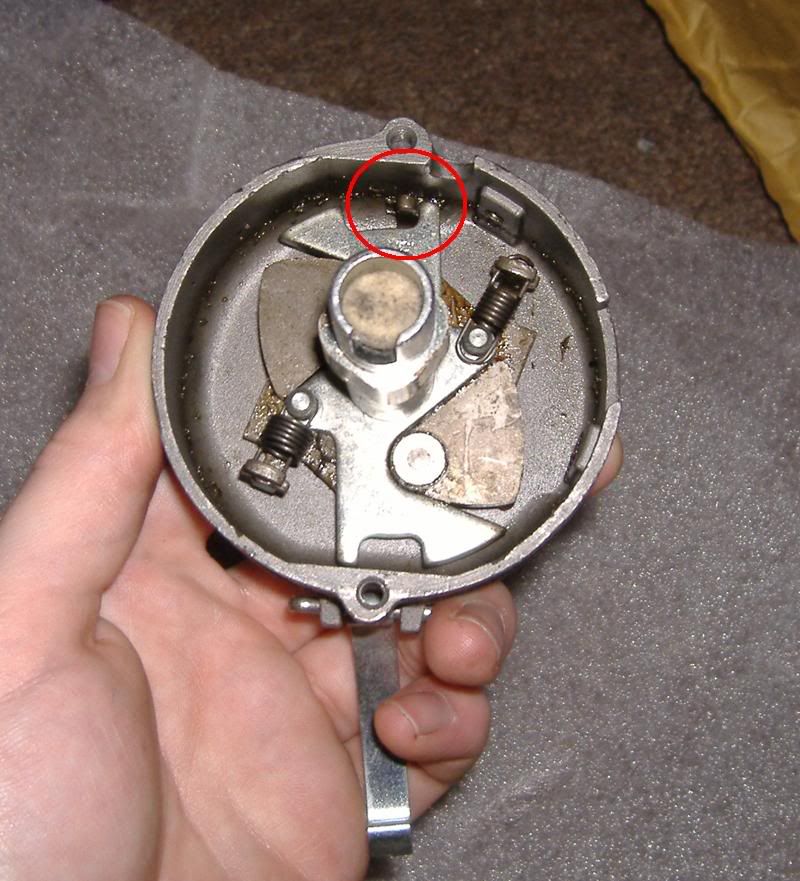 All you need to do is bend the pin (circled) in slightly to limit the travel of the weights, until you get 36-38deg total advance. This is a bit trial