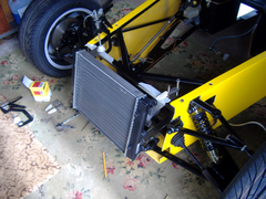 The polo rad is a damn tight fit in the nose cone. I mounted mine at an angle to allow a pipe to be fitted to the bottom. I used a top hose from a bubble shaped rover 400. this has a tight bend which will let the bottom hose clear the chassis tubes.